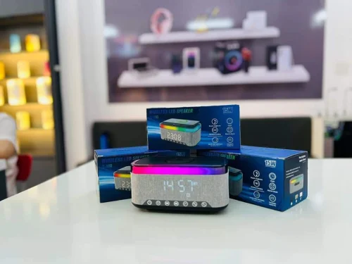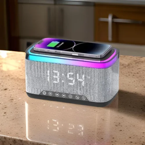 Bluetooth kolonka, həyəcan saatı, rəngli işıq və 10W simsiz şarj funksiyaları ilə təchiz olunmuş bu cihaz, həmçinin powerbank kimi də istifadə edilə bilər.