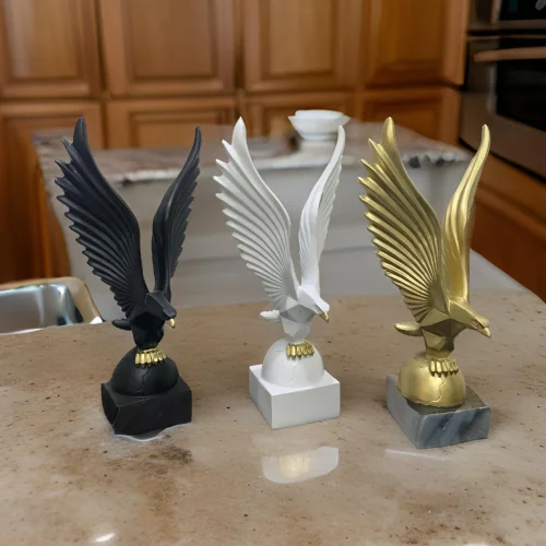 Stol üstü dekorasiya üçün ideal olan bu qartal fiquru, resin materialından hazırlanmışdır. Qızıl, qara və ağ rəng seçimləri ilə ev, ofis və ya otel dekorasiyalarınıza zənginlik qatır.