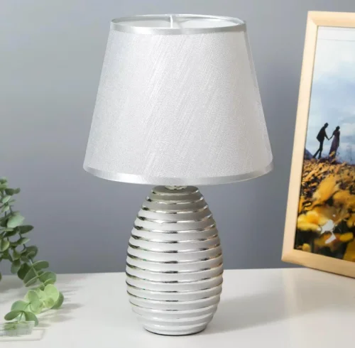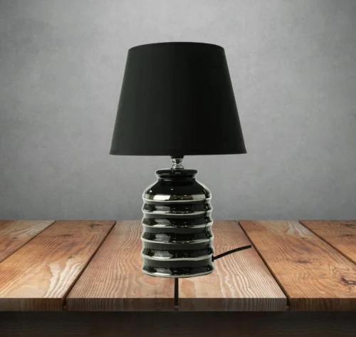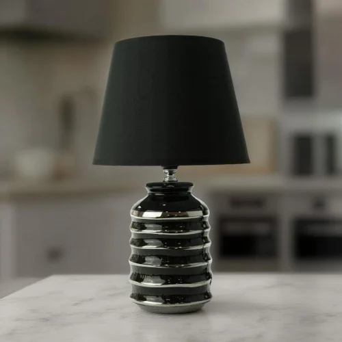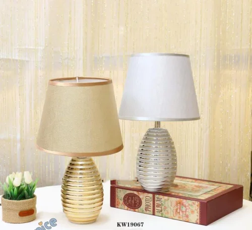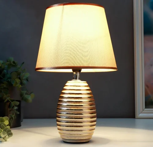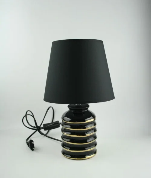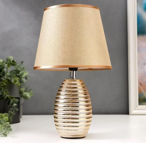 İş masanıza və ya evinizə zəriflik qatın! Qızılı rəngli keramika əsaslı və açıq tonlarda tekstil abajurlu bu lampa həm funksional, həm də dekorativdir.